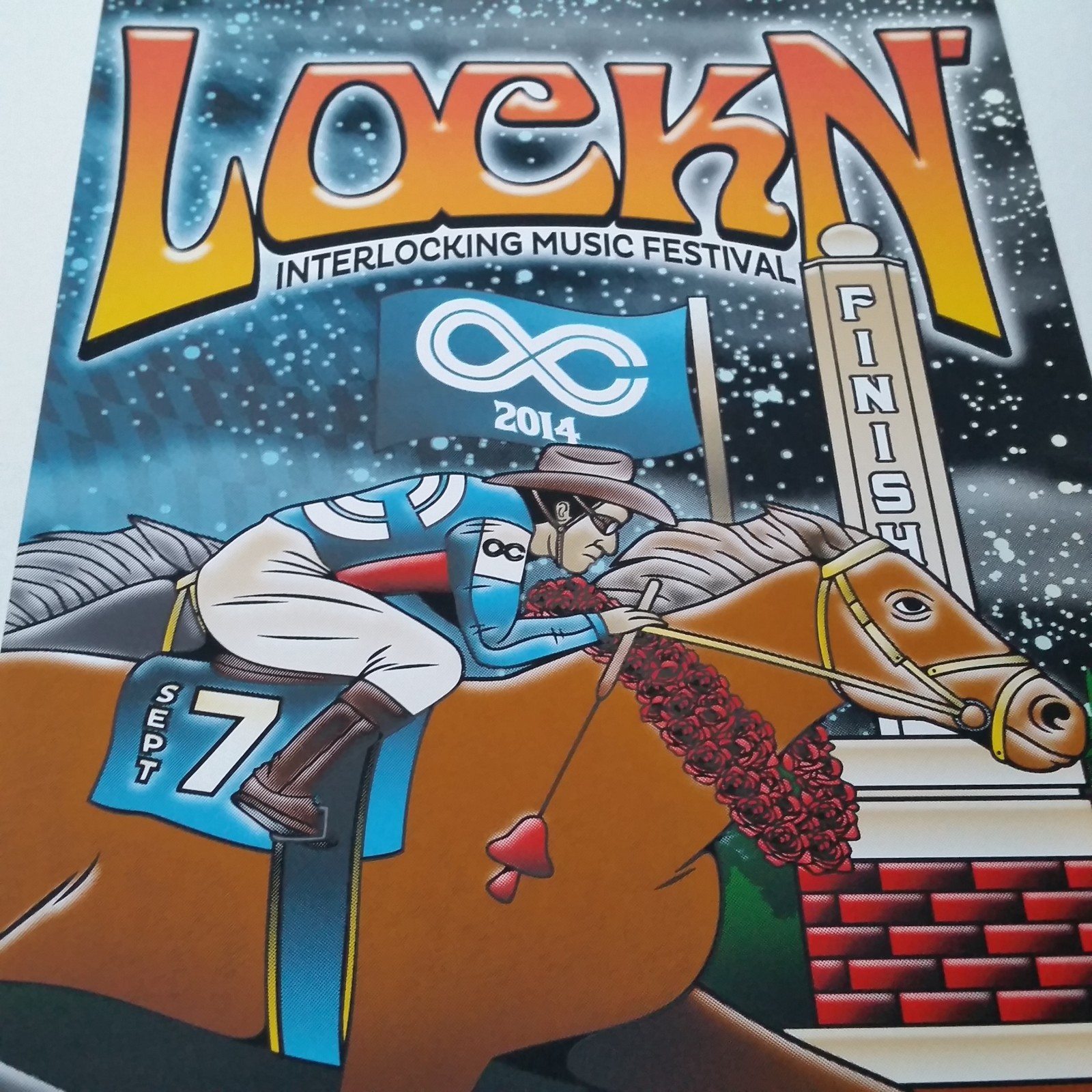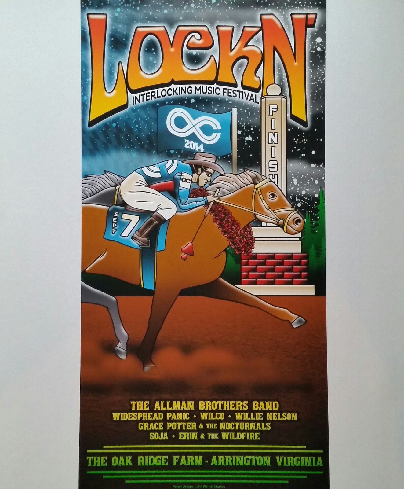 The fourth of four in a series, one for each day of this festival. The posters featuring a horse racing theme in honor of the Oak Ridge track which inspired Lockn’s logo, with the jockeys dressed to reference the festival’s headlining bands.